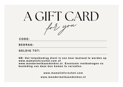 Opzoek naar een origineel, persoonlijk en snel cadeau? Met onze cadeaubon geef je altijd iets bijzonders. De ontvanger kiest zelf uit ons aanbod van handgemaakte en gepersonaliseerde producten - van speenkoorden tot moedermelksieraden en kraamcadeaus.