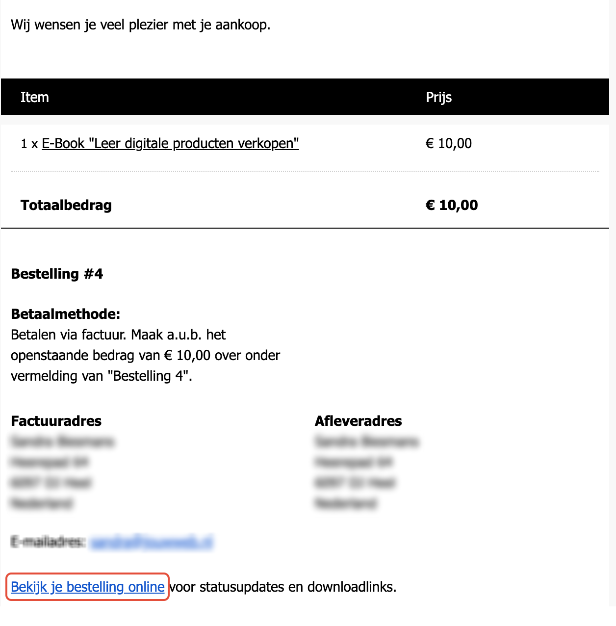 Je ontvangt een mail met daarin de factuur en de bestelgegevens. Onderaan de factuur (Bekijk je bestelling online) kan je een link vinden naar het gekochte digitale product.